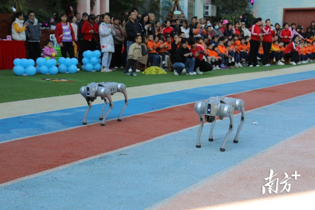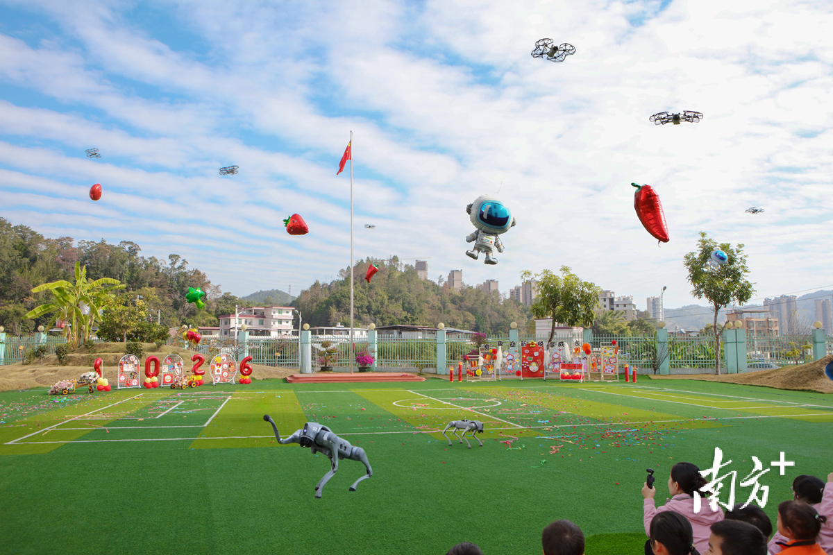 机器狗与无东谈主机在操场上为孩子们献上饰演。